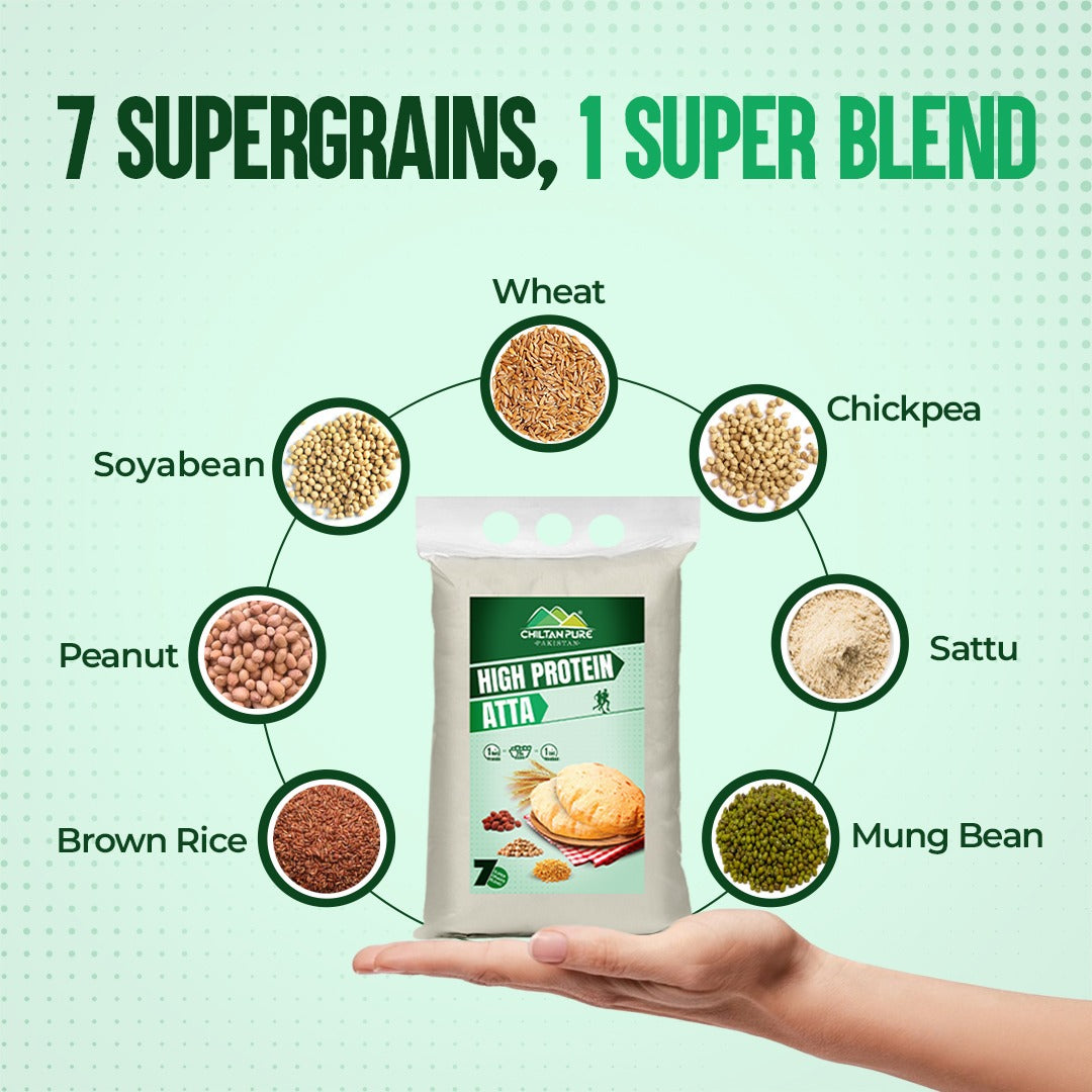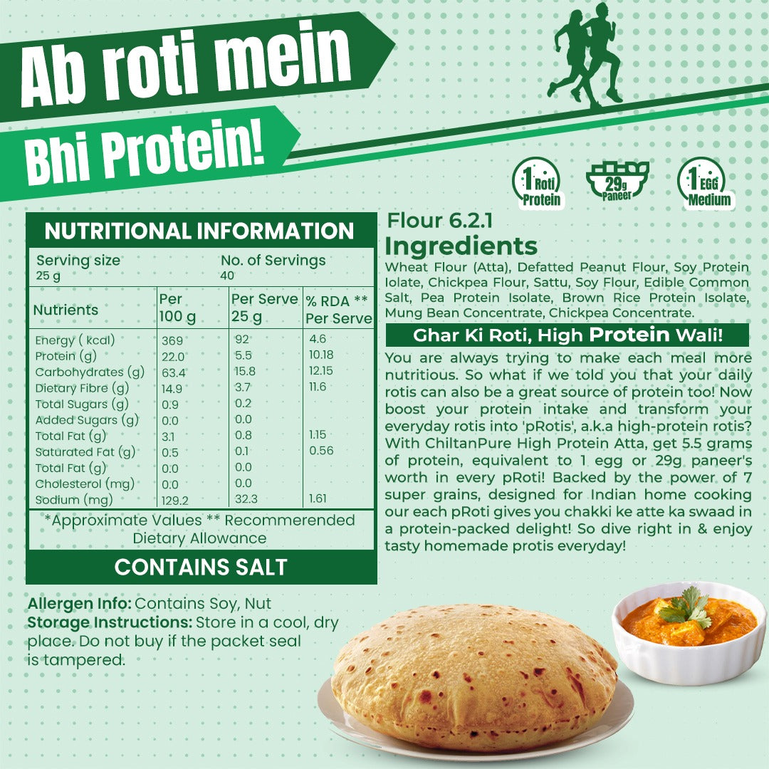 You are always trying to make each meal more nutritious. So what if we told you that your daily rotis can also be a great source of protein too! Now boost your protein intake and transform your everyday rotis into 'pRotis',a.k.a high-protein rotis? With ChiltanPure High Protein Atta, get 5.5 grams of protein, equivalent to 1 egg or 29g paneer's worth in every pRoti! Backed by the power of 7 super grains, designed for Indian home cooking our each pRoti gives you chakki ke atte ka swaad in a protein-packed delight! So dive right in & enjoy tasty homemade protis everyday! Storage Instructions: Store in a cool, dry place. Do not buy if the packet seal is tampered.